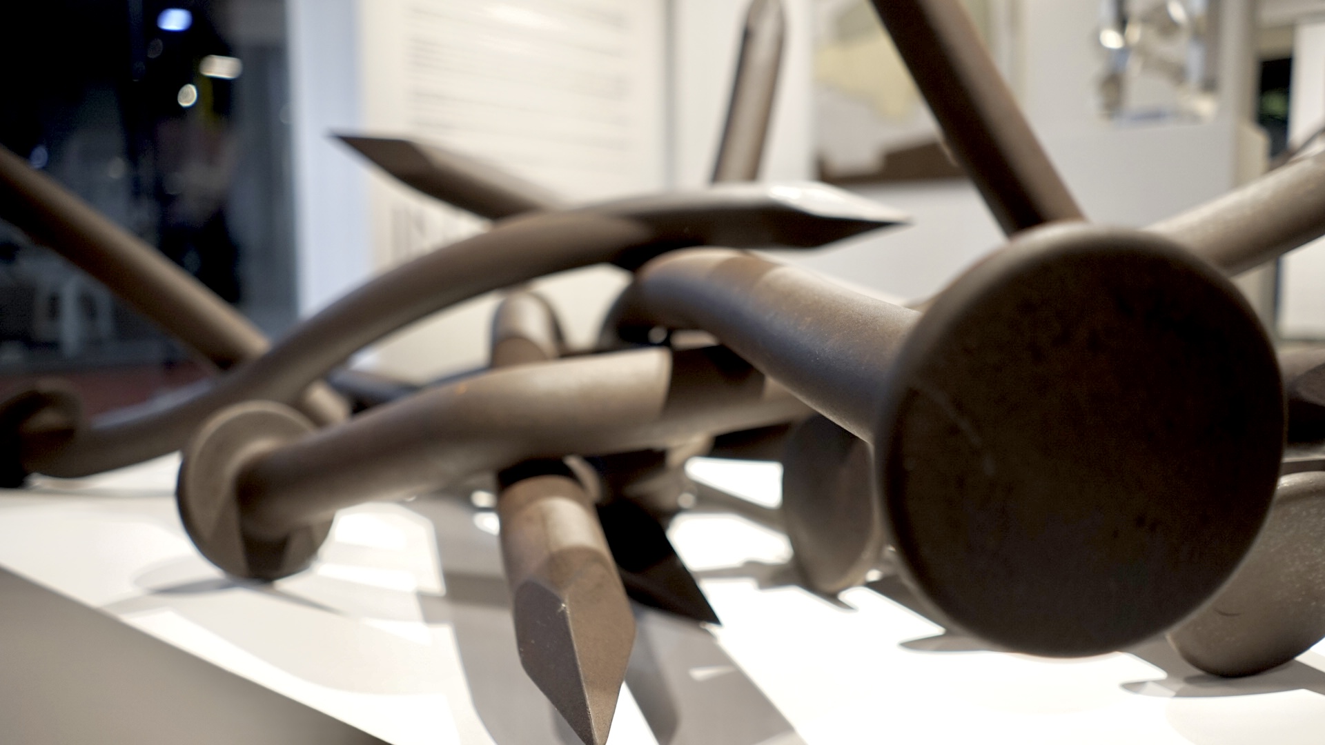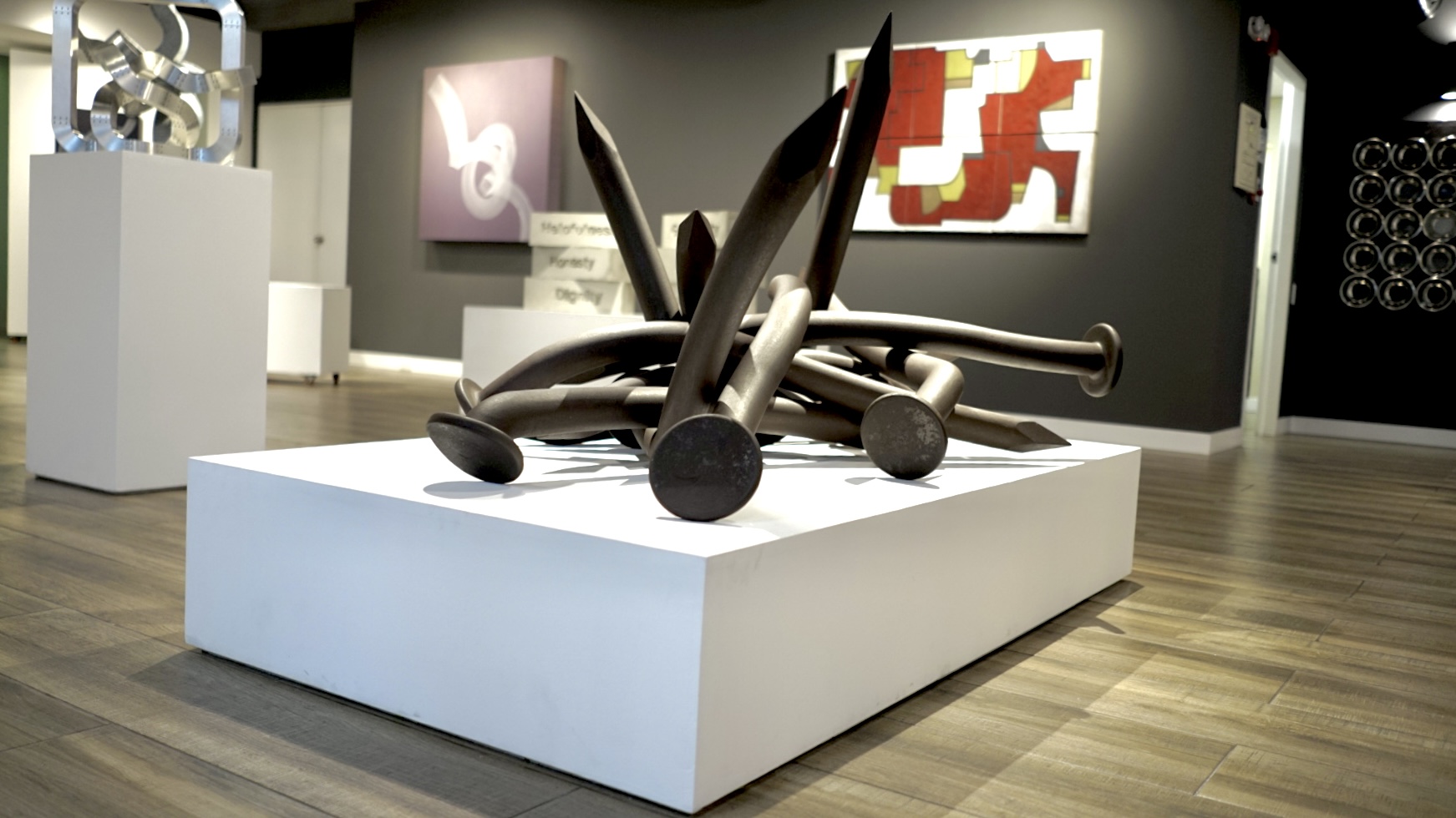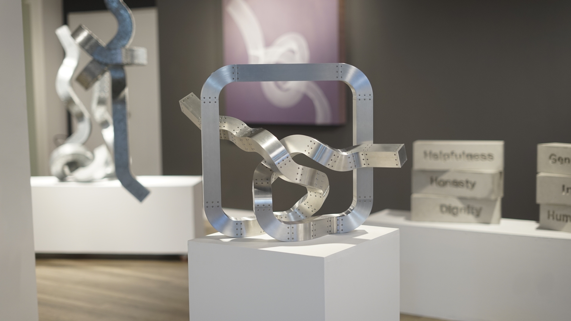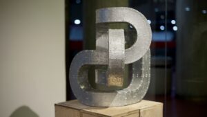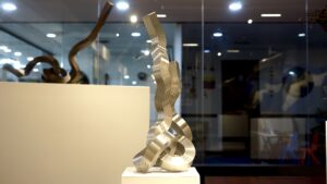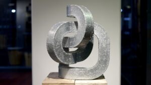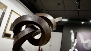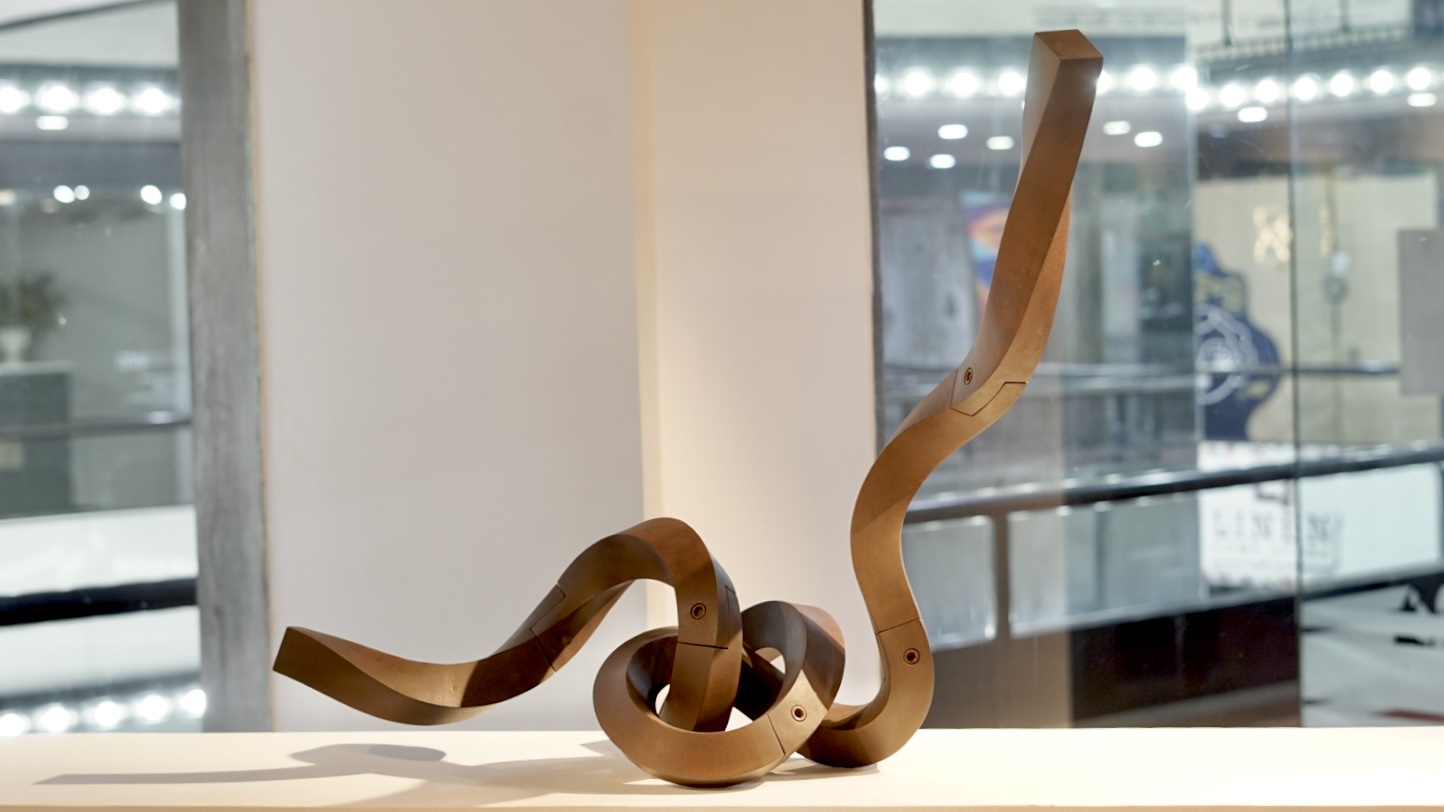 La obra de Alberto Cavalieri, con su magistral dominio técnico sobre el hierro y el acero, determina el juego entre los opuestos: la rigidez frente a la sinuosidad, el peso de la materia ante el desafío a la gravedad y el equilibrio. Este artista propone una dialéctica que se hace perceptible en sus célebres “nudos”, sus creaciones más reconocidas que remiten y representan tanto al problema como a la solución y que, estéticamente, desestabiliza cualquier lectura unívoca del objeto escultórico.