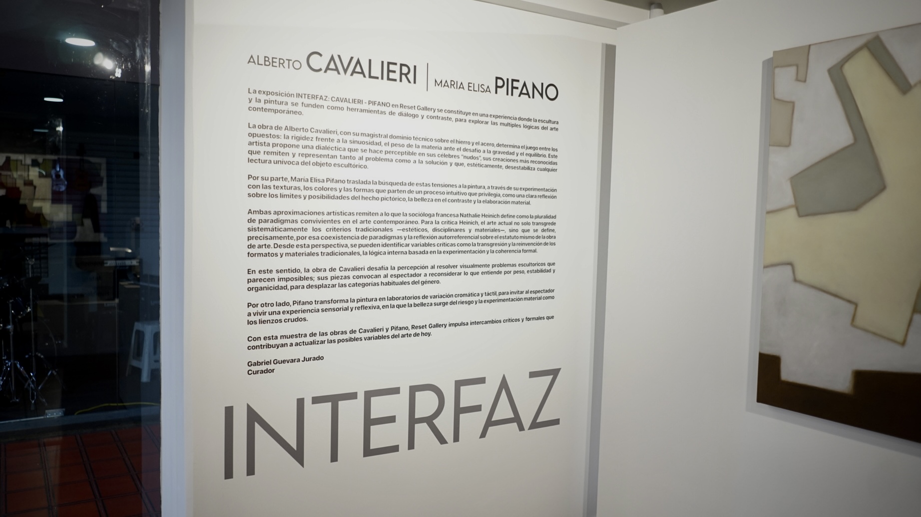 El diálogo activo entre las propuestas de Cavalieri y Pifano manifiesta la pluralidad, la experimentación, la ruptura disciplinar y la reflexión sobre los preceptos que surgen en torno a la obra de arte. La exposición INTERFAZ se convierte así en un espacio donde el arte contemporáneo se muestra en su dimensión más activa y cuestionadora. Con esta muestra de las obras de Cavalieri y Pifano, Reset Gallery impulsa intercambios críticos y formales que contribuyan a actualizar las posibles variables del arte de hoy.