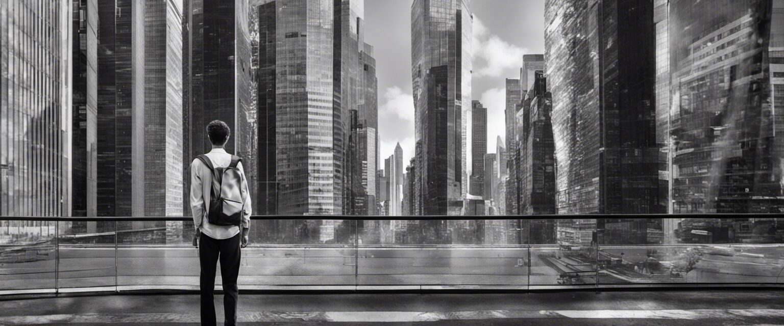 Un joven, emblema de la promesa del futuro, se yergue en el límite de la metrópolis, donde el antiguo y el moderno se cruzan. El manto de nubes y la potencia del sol emergiendo, reflejan la coexistencia de la incertidumbre y la esperanza.2023-10-05-10-00-48