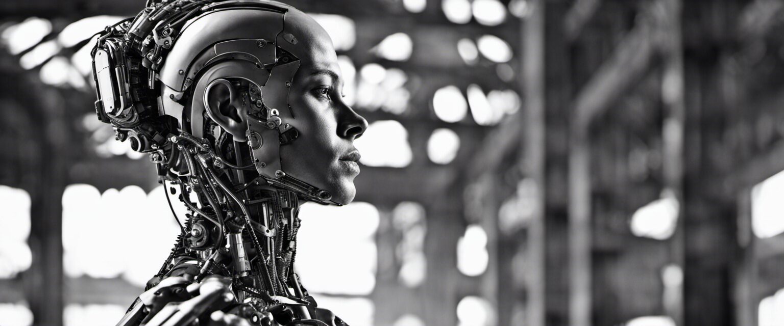 En el yuxtapuesto mundo de acero antiguo y tecnología futurista, un cyborg se yergue, sus ojos blancos y agudos brillan en la penumbra, convirtiéndose en el epicentro de esta dramática fotografía en blanco y negro.2023-10-05-22-00-34