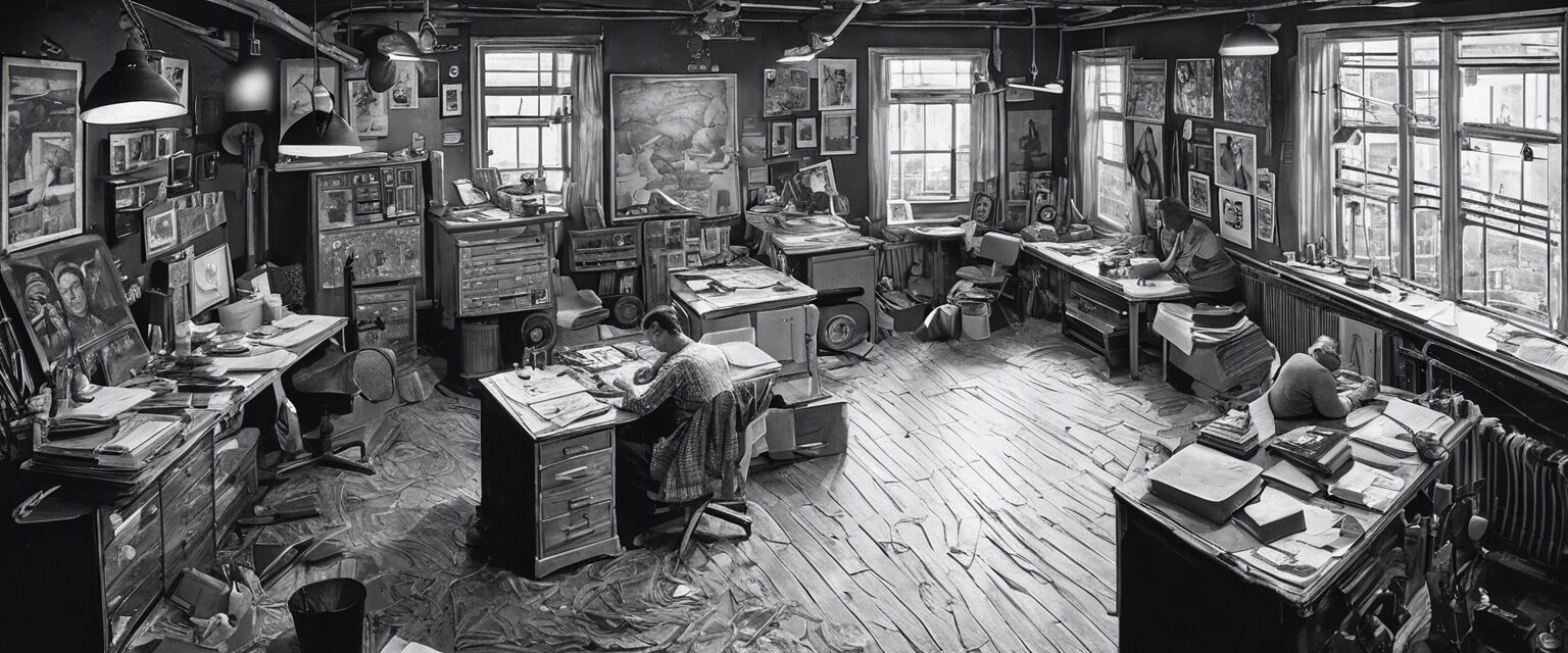 En esta evocadora fotografía en blanco y negro, vemos a un apasionado artista completamente inmerso en su trabajo en medio de la noche. La única iluminación del estudio proviene de una solitaria bombilla colgante, diseÒo intencionado para crear un retrato dramático y llamativo de un hombre dedicado a su oficio.2023-11-15-22-47-58