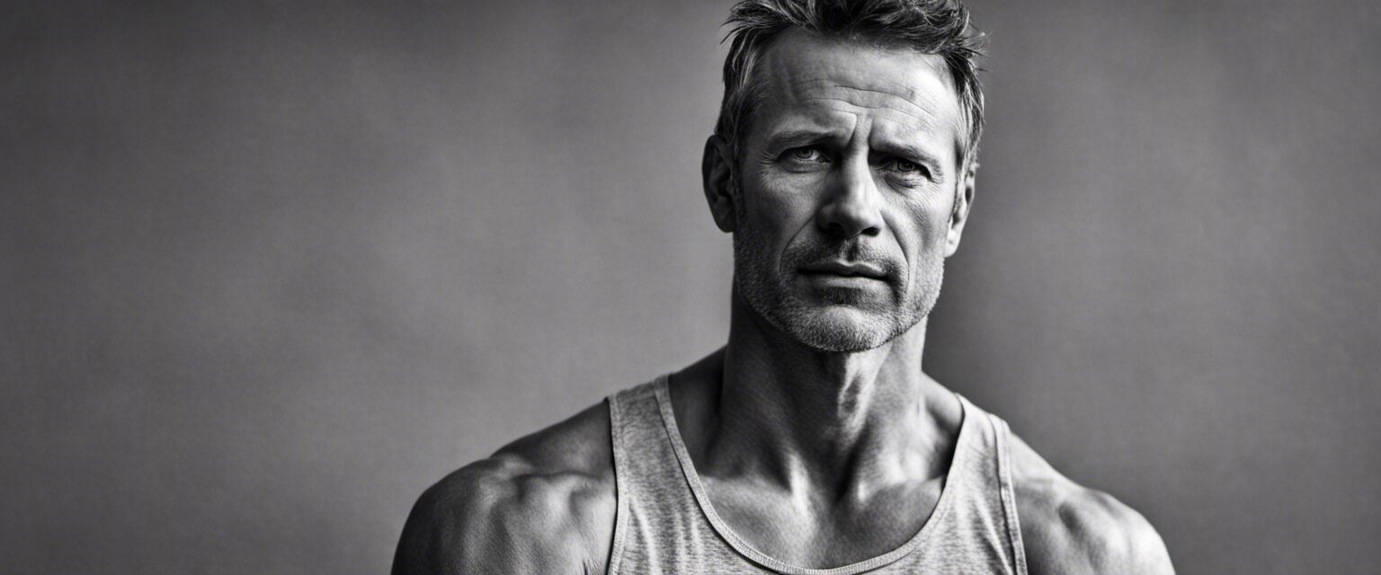 Retrato en blanco y negro de un hombre en sus cuarenta aÒos evidenciando la fuerza y el dinamismo del cuerpo humano. La combinación de la iluminación sutil, el fondo oscuro y la postura segura del sujeto revela la cruda y a la vez atemporal realidad del mero hecho de ser cuerpo..2023-10-03-22-00-45