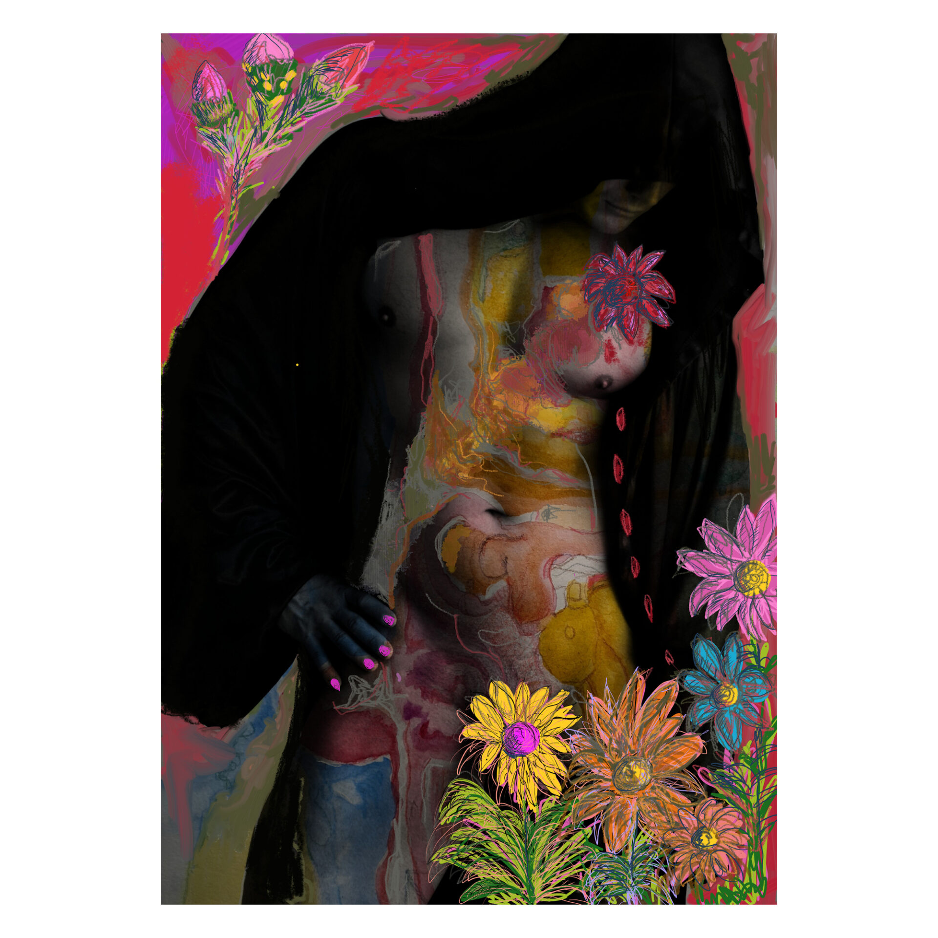 La figura combina anonimato y expresión simbólica. El torso intervenido con motivos florales transforma el cuerpo en territorio orgánico y espiritual, en relación con el erotismo como energía de transformación y acto ritual.