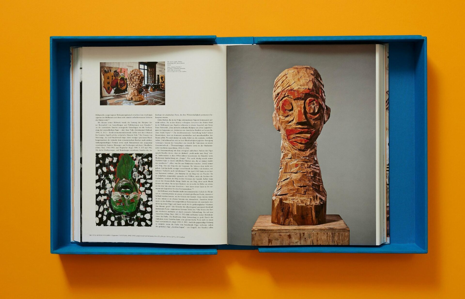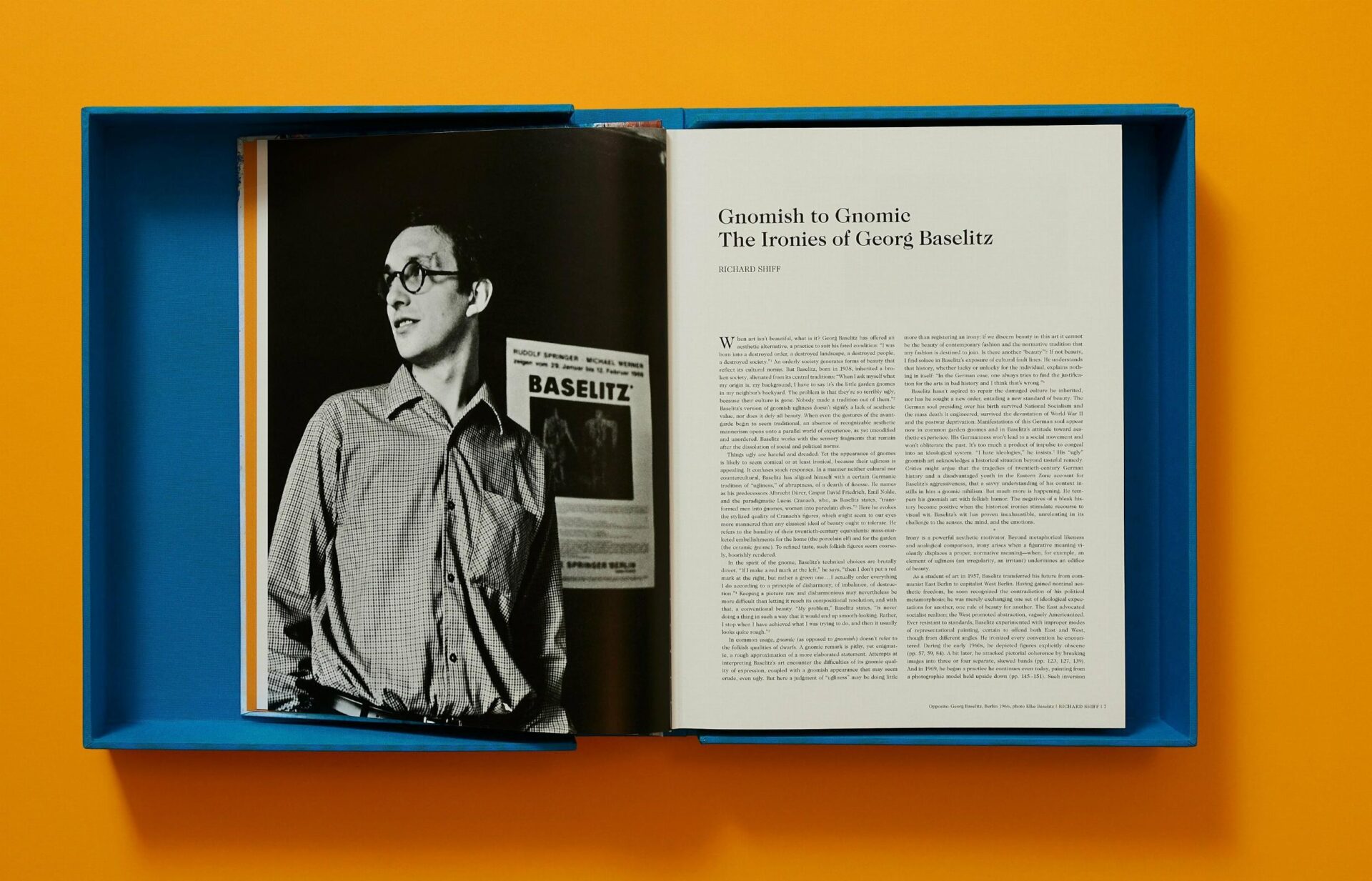 Esta monografía de gran tamaño y profundidad sobre la obra del artista presenta reproducciones de gran formato de más de 400 obras en todos los medios, además de planos de instalaciones y retratos, junto con textos que abordan el tema desde diferentes perspectivas: un retrato del artista y su oscuro sentido del humor realizado por el veterano conocedor Richard Shiff, un ensayo sobre su formación y desarrollo como pintor por el crítico Jonathan Jones, otro sobre la obra escultórica de su escandaloso éxito en la Bienal de Venecia de 1980 por la historiadora del arte y comisaria Eva Mongi-Vollmer, otro sobre sus estrategias artísticas por la historiadora del arte y comisaria Carla Schulz-Hoffmann, una colección de pequeños textos literarios relacionados con el uso que el artista hace del mito y la historia por el autor y director Alexander Kluge, y una conversación de estudio con el periodista de arte Cornelius Tittel. Este estudio sin precedentes sobre la obra de Georg Baselitz se completa con declaraciones del artista a lo largo de los años y una biografía ilustrada.