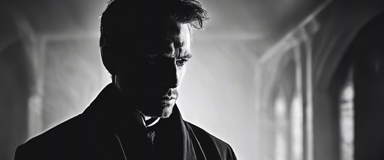 El pecado se cierne sobre la pureza, representado por un solitario hombre, desafiantemente enfrentándose a la cámara desde el oscuro abismo de la penitencia. Una catedral sumida en la niebla presenta un fuerte contraste, evocando un balance perturbador entre la oscuridad y la luz, el bien y el mal, el pecado y la redención.2023-12-09-22-00-24