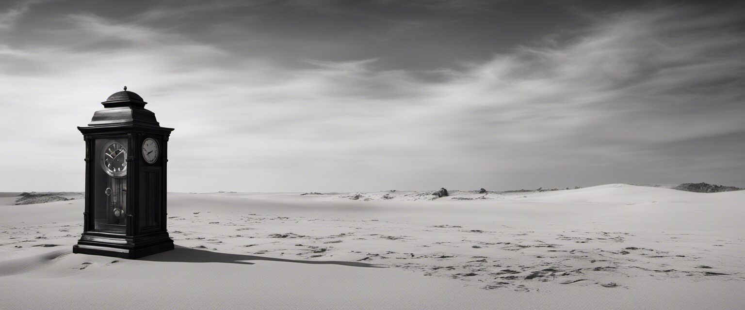 En este cautivador paisaje grisos, el protagonista es un antiguo reloj varado en el tiempo y en la soledad del espacio, retando nuestra concepción de la realidad y la insignificancia del hombre ante el inexorable paso del tiempo.2023-11-13-16-00-39