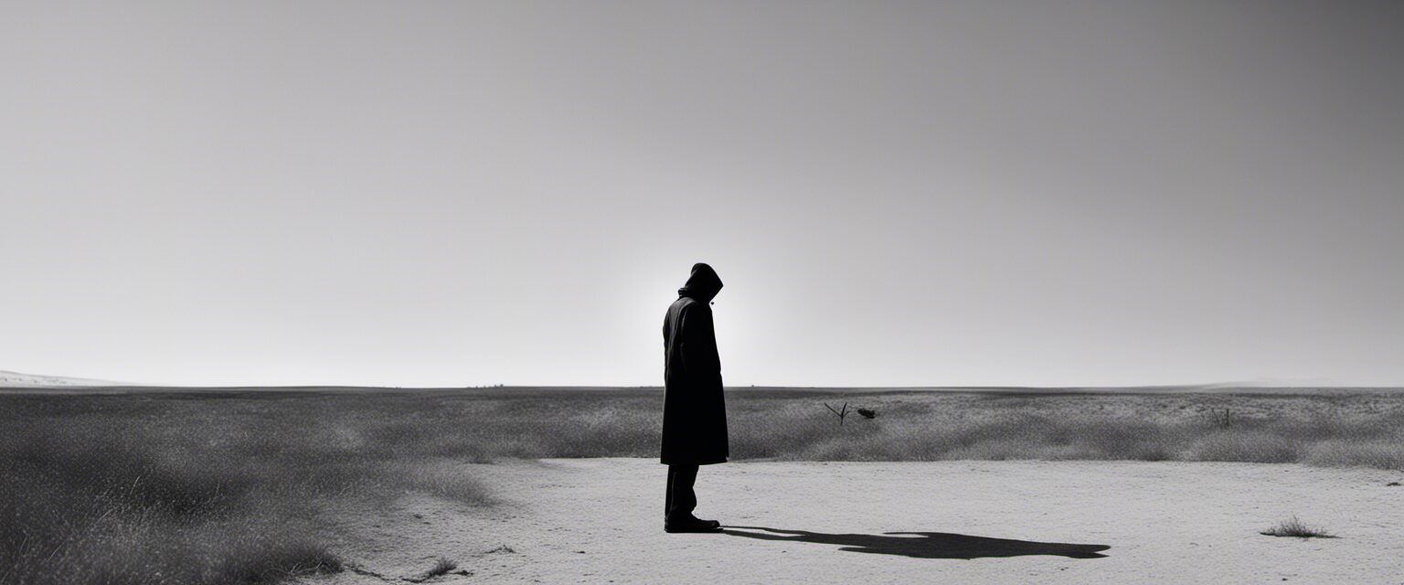 En esta fotografía blanco y negro, de alta resolución y detallada, se puede apreciar la figura solitaria de un terrícola, rodeado por la inmensidad del universo, recalcarndo su insignificancia pero al mismo tiempo, su impacto en el cosmos.2023-11-06-10-00-53