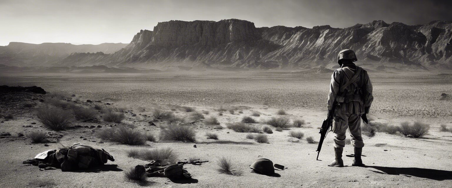 Un soldado vigilante emerge de las sombras, su silueta solitaria contrastando contra la desolación del paisaje árido. Este es, innegablemente, la dura y cruda representación de la guerra en Israel.2024-01-29-16-00-40