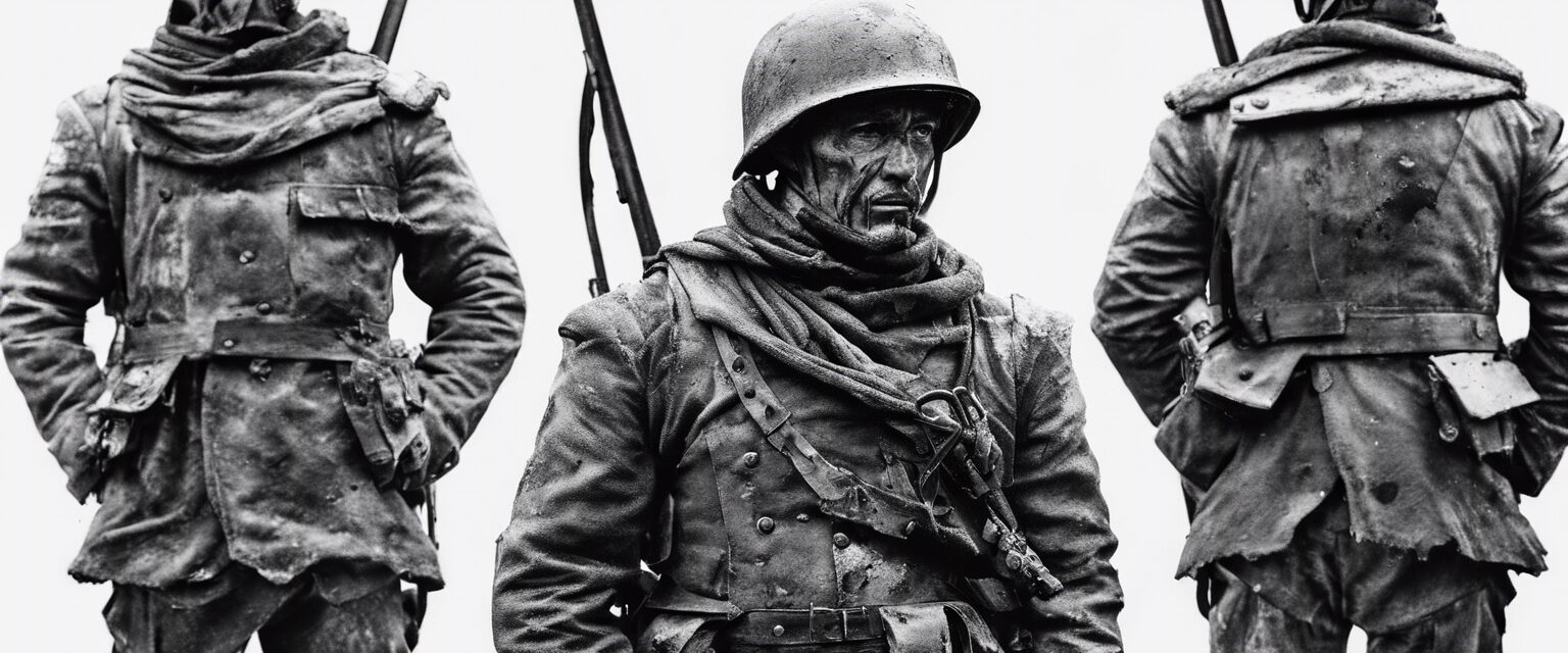 Un soldado curtido se encuentra solo en medio de un campo de batalla desolado, personificando la tortuosa realidad de la guerra. Su mirada resoluta y aspecto agotado reflejan los muchos desafíos que ha enfrentado. ‘Yo soy la guerra’ se materializa en su presencia, un silencioso, pero elocuente retrato de resistencia y valentía.2023-12-09-04-01-00