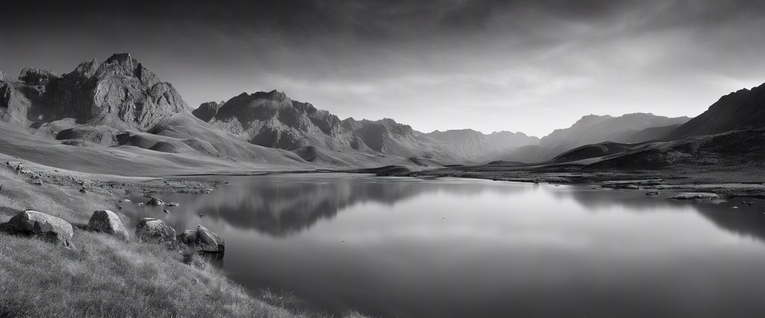 Un escenario de montaÒas y río, capturado en la rica textura del blanco y negro. La ausencia de color intensifica el dramatismo de los altos picos y la serenidad del agua fluida, logrando una instantánea perfecta de la poesía no dicha de la naturaleza.2024-01-06-16-00-28
